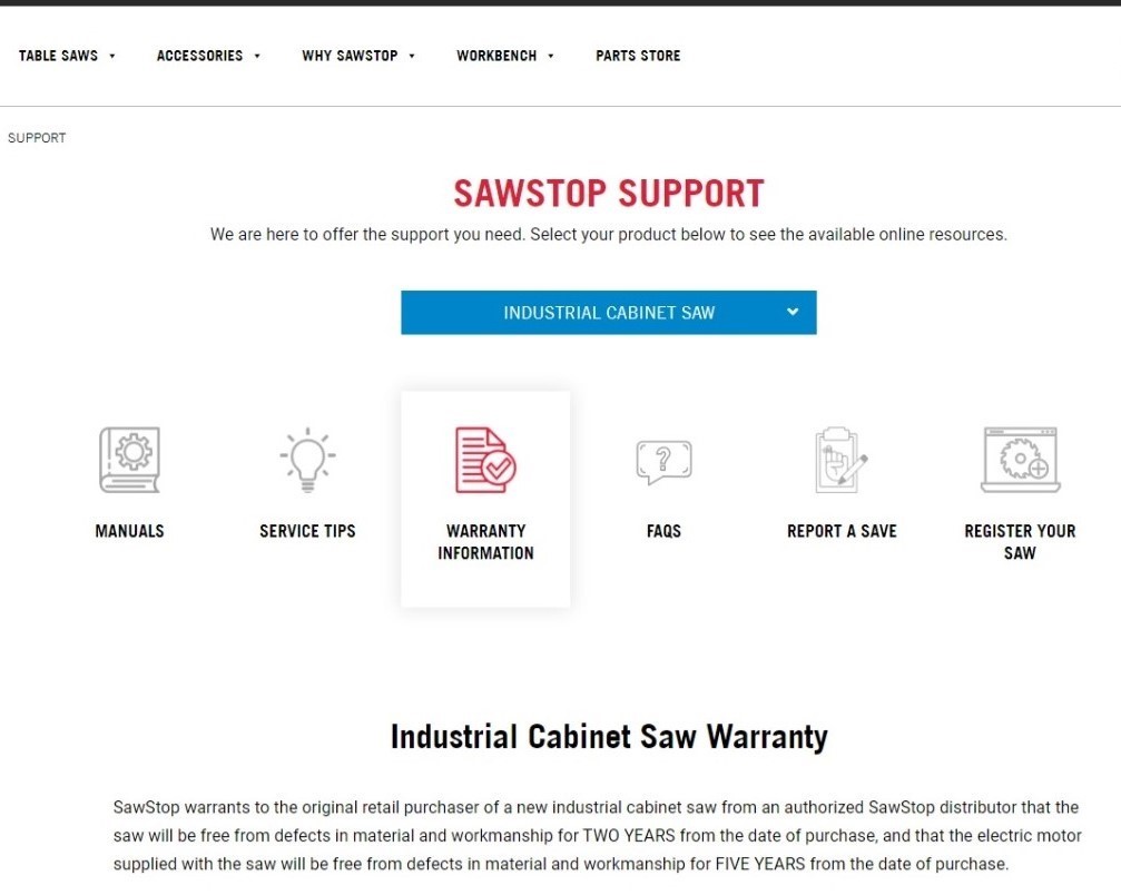 5. Service: In those rare instances when something does go wrong, our top-flight service team is always ready to help. Link to service portal: Contact Us | SawStop.